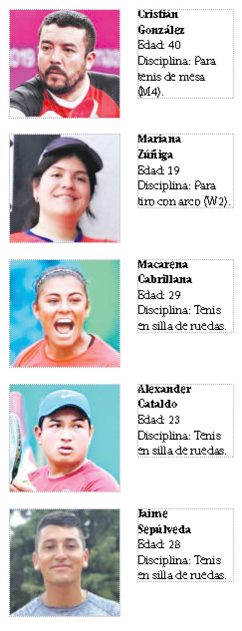 Otra buena noticia es que la mitad de los participantes nacionales debuta en la prueba, siendo el tenis de mesa el que aporta la mayor cantidad, con Tamara Leonelli, Cristián González y Luis Flores. Mientras que los restantes son Ignacio Almonacid (para natación); Camila Campos y Marión Serrano (para powerlifting); la mencionada Mariana Zúñiga; Alexander Cataldo y Jaime Sepúlveda (tenis en silla de ruedas). “Es lo mejor que me ha pasado en mi carrera deportiva. Son mis primeros Juegos Paralímpicos y estoy seguro de que me van a marcar como persona y como deportista”, dijo este último en la víspera.