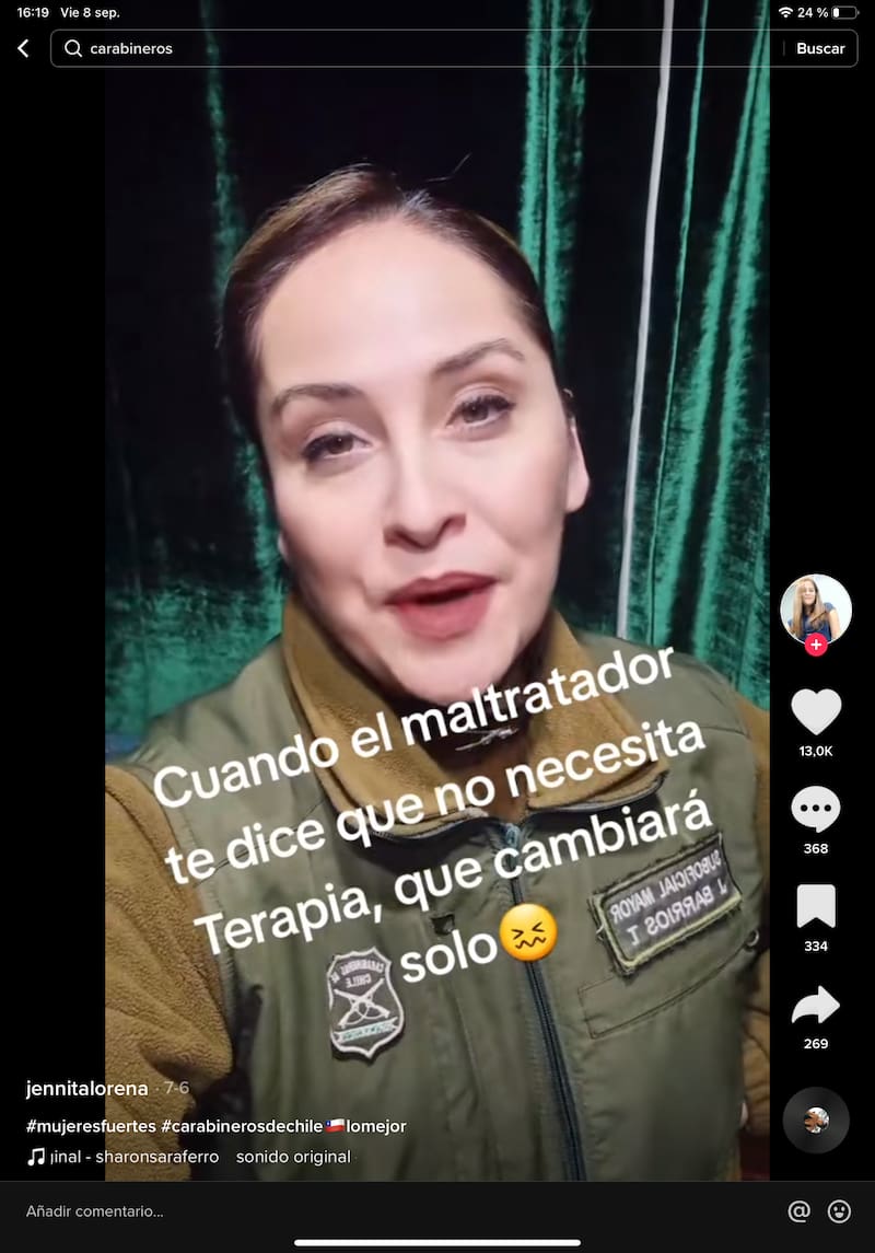 El impacto que ha tenido la cuenta de TikTok de la suboficial mayor es evidente. En su bandeja de entrada acumula más de 900 mensajes. Dice que son varias las mujeres que han sido víctimas de VIF las que le escriben pidiendo orientación. Entre los comentarios en sus videos se pueden leer testimonios de mujeres que atravesaron este tipo de situación: “Gracias a una carabinera, hace muchos años, pude salir adelante, ella me rescató de un episodios de violencia que yo ocultaba a toda mi familia”, dice una usuaria. “Gracias a este video un día yo dije nunca más. Y aquí estoy, viva y luchando feliz junto a mis hijos”, comenta otra.