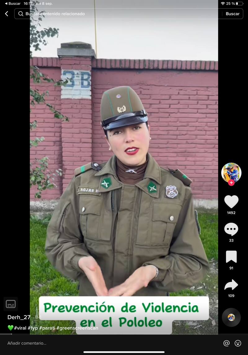 Jennifer Barrios no fue la única. A pesar de que no hay una cifra consolidada, son varios los casos conocidos de carabineros que participan en TikTok. La cabo segundo Dina Rojas (30), de la Tercera Comisaría de Talca, es una. Un mes después de que la suboficial Barrios subiera su primer TikTok uniformada, el 13 de julio de 2022, Rojas hizo lo mismo. Ese día se conmemoraba a la mujer carabinera, por lo que decidió compartir a sus 115.300 seguidores un video vistiendo el uniforme institucional. Entre los 85 comentarios que tiene la publicación se ven emojis de besos y mensajes felicitándola.