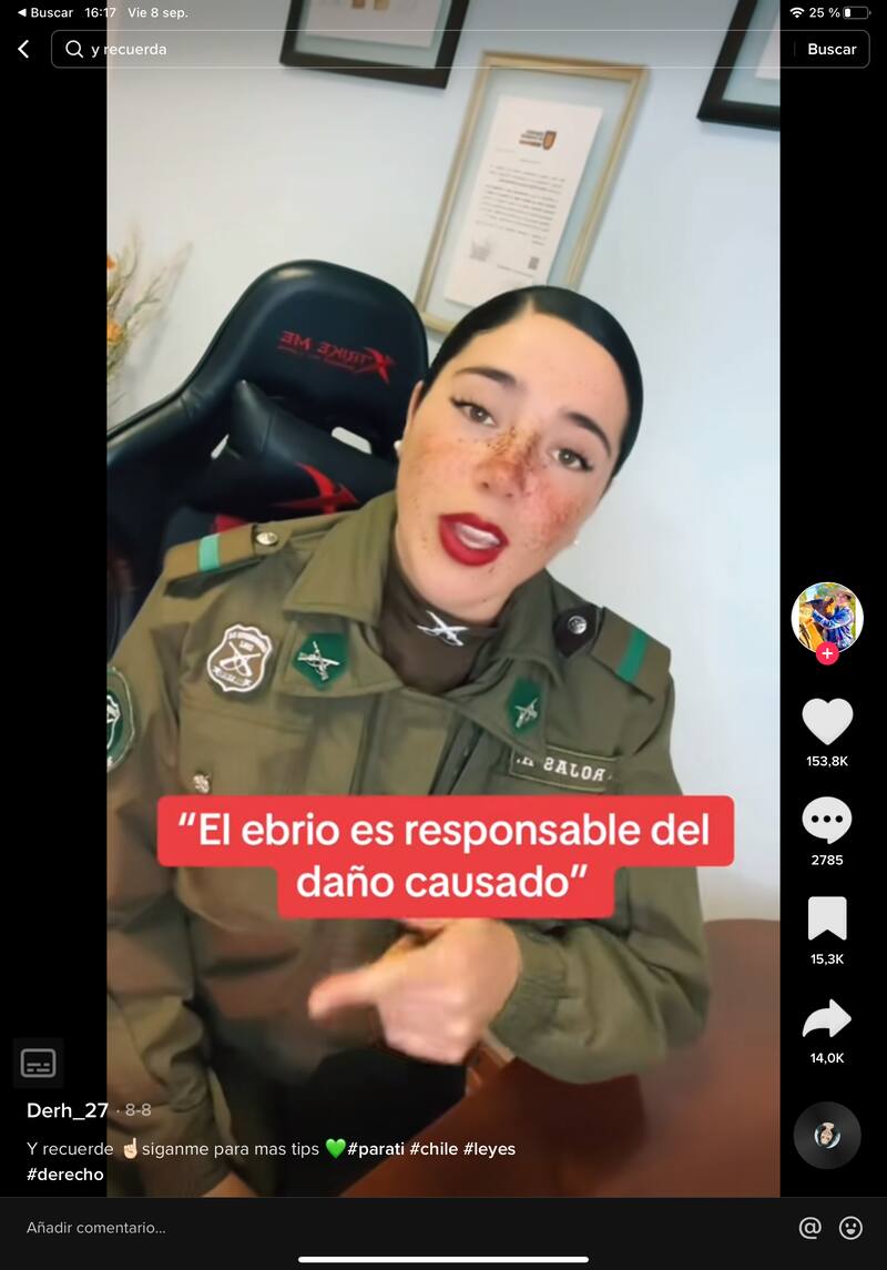 En la misma línea, el segundo video que Rojas tiene anclado en su perfil tiene un parecido a los posteos de Barrios: aparece ella con un efecto que simula pecas en su cara. En este dice: “Y recuerda… si tu pololo, andante, quedante o pareja te dice: pfff, si curao no vale. Artículo 2.318, Código Civil, el ebrio es responsable del daño causado”. En el comentario, escribe: síganme para más tips. La cabo segundo argumenta que hoy la violencia está muy normalizada, especialmente en la adolescencia. Por esto, habla con términos que ellos mismos usan.