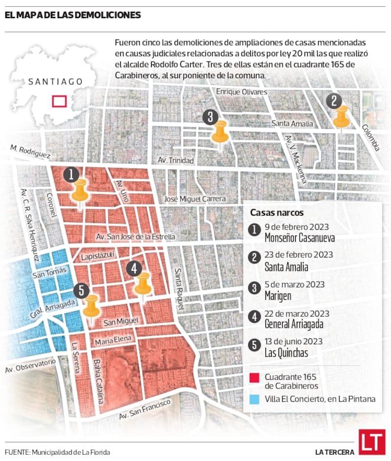 Era el 9 de febrero de 2023 y el alcalde de La Florida, Rodolfo Carter (independiente ex UDI), anunciaba su nuevo plan: la Política de Recuperación de Barrios. Frente a un grupo de periodistas, y acompañado de cuatro carabineros, la definió ese día como una “política pública permanente”. Ahí también entregó la razón por las que iba a empezar a demoler esas ampliaciones: no podía permitir que los narcotraficantes tuvieran “caletas” donde guardaran droga y que siguieran operando su negocio desde las cárceles.