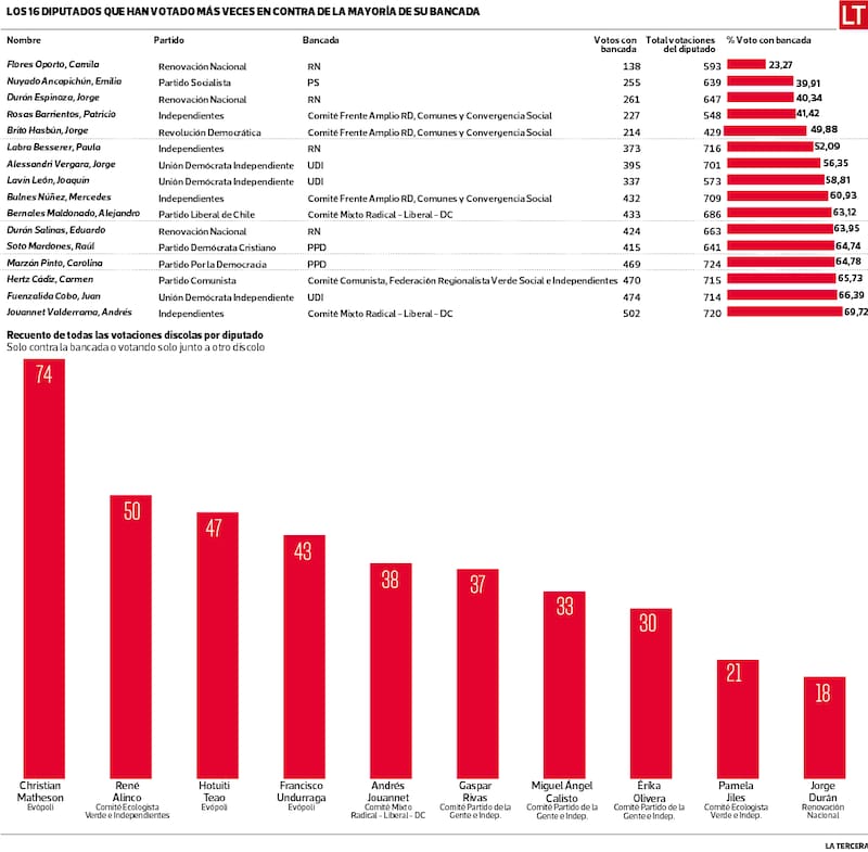 El listado lo lidera Christian Matheson, con 74 votaciones díscolas. Le siguen René Alinco, con 50; Hotuiti Teao, con 47; Francisco Undurraga (jefe de bancada de Evópoli), con 43; Andrés Jouannet, con 38; Gaspar Rivas, con 37; Miguel Ángel Calisto, con 33; Érika Olivera, con 30; Pamela Jiles, con 21, y Jorge Durán, con 18.
