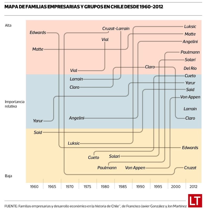 Jon Martínez repasaba en 2012 la nueva hegemonía de apellidos y decía hace unos años que muchas de las mayores familias empresarias de alto peso en la actualidad tenían un tamaño menor a fines de los sesenta y setenta, como los Luksic y los Angelini. Y puntualizaba que varias de las más prominentes familias empresariales se desarrollaron en los últimos veinte o treinta años, como Horst Paulmann, con Cencosud; o los Solari, Cúneo y Del Río, con Falabella y Sodimac; o los Cueto, con Latam Airlines; o los Von Appen y su imperio portuario y naviero.