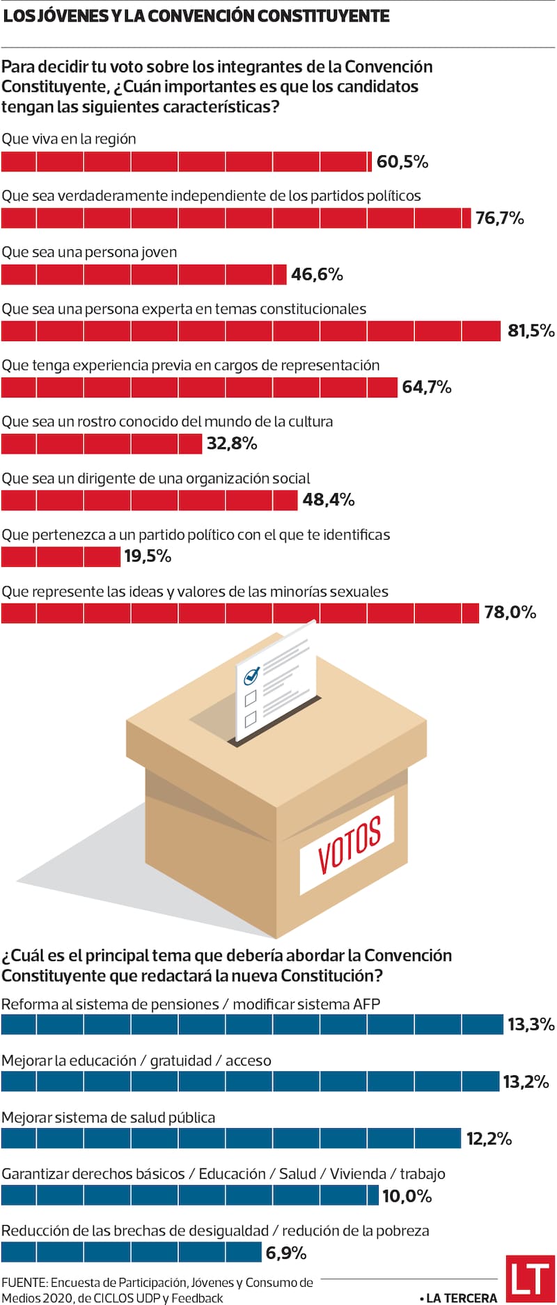 “Hay un acuerdo mayoritario y transversal en los jóvenes sobre las características más importantes que influirán en su decisión de voto a potenciales constituyentes: deben ser expertos en temas constitucionales, representar las ideas y valores de las minorías sexuales y ser verdaderamente independientes de los partidos políticos”, plantea Juan Pardo, socio director de Feedback.