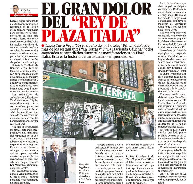 Al hacer un recorrido mental por las imágenes que tiene grabadas de lo que les ocurrió a sus negocios familiares durante el estallido, Francisco Lucio Torre reconoce que hay una en particular que no puede sacarse de la cabeza. Es una foto que vio en un diario junto a sus otros dos hermanos: en plena Avenida Vicuña Mackenna, sentado en una de las sillas del restorán La Hacienda Gaucha, un encapuchado sostenía una copa de vino robado del local.