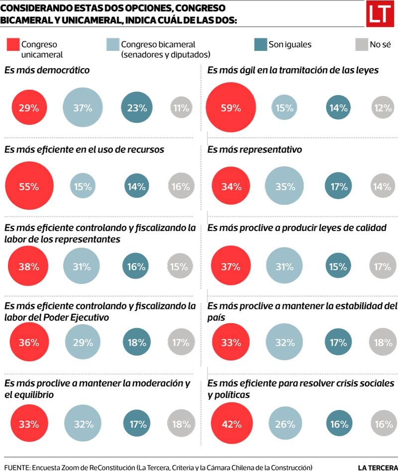 Dentro de este último ítem, la encuesta consultó acerca de las ventajas y desventajas que ven en el bicameralismo y el unicameralismo. De esta forma, se concluyó que el 59% piensa que la unicameralidad sería más “ágil en la tramitación de las leyes”, mientras que un 15% cree que lo sería un Congreso compuesto por dos cámaras.