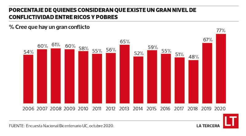 Hay otro dato que demuestra que en cuanto a percepciones sí habría un aumento de la polarización entre élite versus pueblo, y es el que arrojó la Encuesta Nacional Bicentenario de la UC, publicada en octubre de este año: un 77% de los encuestados cree que existe un alto conflicto entre ricos y pobres. Desde el 2006 que se viene midiendo esta arista, y este año obtuvo el porcentaje más alto, en comparación con el 2019, donde un 67% aseguraba que existía un alto grado de conflicto o incluso en 2018, donde se obtuvo el menor nivel desde que se comenzó a medir, con un 48%. Esa medición para Izikson ha venido a develar una realidad que en Chile parecía olvidada desde el retorno a la democracia: “La élite hoy día siente temor al pueblo, porque no lo conocen. Y el pueblo siente rabia hacia esa élite”.