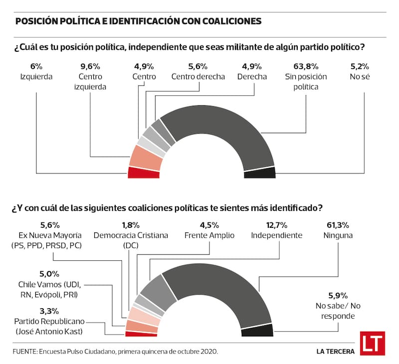Esta diferencia tendría una explicación, advierten, en que desde hace varios años que a la ciudadanía el eje izquierda-derecha no le hace sentido. No por nada según la última medición de Pulso Ciudadano, el 64% de la población no tiene posición política, y un 60% no se identifica con ningún partido o coalición. Esa teoría es la que más le hace sentido a Ramón Cavieres, director de Activa Research, empresa que hace estas encuestas quincenales. “Las personas están en un cuestionamiento, en una pérdida de credibilidad y confianza de las élites políticas, económicas, y todo aquello que implique privilegios. La población no está ideologizada políticamente, las élites sí, y eso genera desconexión”.
