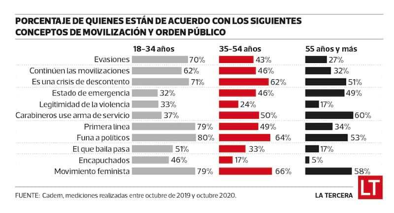 Pero existe un tercer tipo de polarización que para Izikson es la más significativa y es la que será más permanente que la división entre la élite y el pueblo: la generacional. “Desde hace dos años, y ya con mucha claridad después del estallido, se abrió una grieta entre la forma en cómo los jóvenes de 15 a 30 años ven y piensan el mundo versus el resto de las generaciones”, dice él. Prueba de ello son las mediciones de Cadem entre octubre de 2019 y octubre de este año, ante la pregunta de si está de acuerdo o no la población con algunos conceptos de movilización y orden público. Por ejemplo, el 70% de los encuestados entre 18 y 34 años manifiesta estar de acuerdo con las evasiones. En el grupo de 35 a 54 años, un 43% las aprueba, y en los mayores de 55 solo lo hace un 27%. Esta diferencia se hace más grande todavía al momento de evaluar a la primera línea: en los más jóvenes, un 79% está de acuerdo con ellos, mientras que en los mayores de 55 es aprobada solo por el 34%.