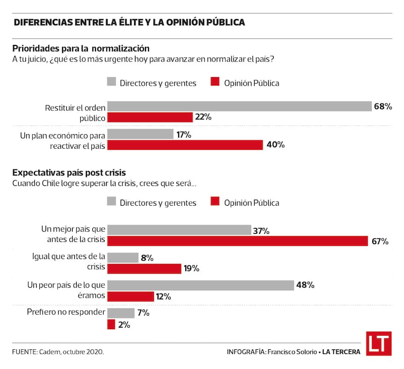 Esto también se ha traducido en grandes diferencias entre la élite económica y la opinión pública a la hora de opinar sobre temas contingentes. Así lo demostró la última encuesta Cadem de agosto. Ante la pregunta ¿qué es más urgente hoy para avanzar en normalizar el país?, un 68% de los directores y gerentes señala que debe ser prioridad restituir el orden público, sin embargo, solo un 22% de la opinión pública coincide con esa medida. Luego, ante el planteamiento "cuando Chile logre superar la crisis, ¿crees que será…? Un 67% de la opinión pública cree que será un mejor país que antes, pero solo un 37% de los líderes económicos piensa lo mismo. Más grande se hace la brecha ante la opción de que Chile será un peor país de lo que éramos: ahí un 48% de la élite económica se identifica con esa respuesta, frente a solo un 12% de la opinión pública.