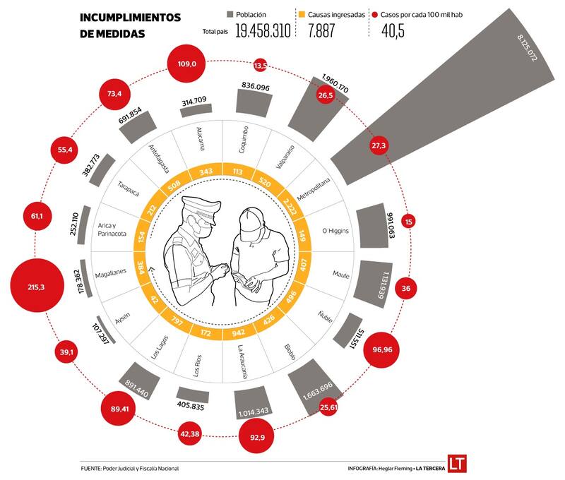 Este caso es solo un ejemplo de la compleja situación que se vive en la zona centro del país, donde existen altas tasas de incumplimiento de las medidas sanitarias adoptadas por las autoridades. Solo en Valparaíso, el Ministerio del Interior ha presentado 34 querellas por infracción al artículo 318, que sanciona a quienes ponen en peligro la salud pública. Según los registros del Poder Judicial, Valparaíso registra una tasa de 26,5 causas judicializadas de casos de incumplimiento por cada 100 mil habitantes. Un factor que preocupa a las autoridades locales, tras conocer que la V Región es la segunda zona del país, detrás de Santiago, con más casos nuevos casos y contagios del virus. “Las medidas de fiscalización cada día se van a endurecer más”, aseguró el miércoles el intendente de la V Región, Jorge Martínez.