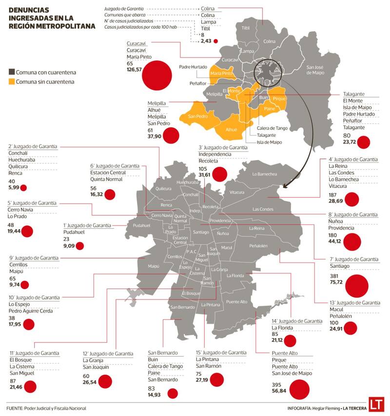 Y los alcaldes también han jugado un rol clave en denunciar a los infractores. El viernes 19, Joaquín Lavín denunció una fiesta en calle Roger de Flor, en Las Condes, en la que había tres personas con sumarios y sanciones sanitarias previas. Entre las querellas, está una denuncia interpuesta a siete personas que andaban en un auto cuando había toque de queda. En el 4° Juzgado de Garantía, que agrupa a Las Condes, la Reina, Lo Barnechea y Vitacura, hay 187 infractores, con una tasa de 28,69.
