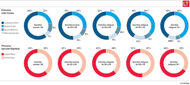 Quizás el dato más impresionante aparece en la primaria de Chile Vamos. Entre los votantes menores de 30 años que respaldaron al bloque, de acuerdo con el análisis, Sichel tuvo el 60% de los votos, seguido por Lavín con casi un tercio de ese porcentaje (22%). Una tendencia que se mantuvo en los votantes que estaban entre los 30 y los 50 años: tanto en los denominados “nuevos” -es decir, que no se habían inscrito en los registros electorales antes de la reforma de hace una década- como en los “antiguos”, el exministro y expresidente de BancoEstado superó el 50%, mientras el exalcalde de Las Condes quedó por debajo del 30%. De ahí para arriba, el escenario fue distinto: sólo 5 puntos de ventaja para Sichel en los votantes entre 50 y 70 años (41% a 36%), y Lavín con un punto a favor en los mayores de 70 (43% a 42%).