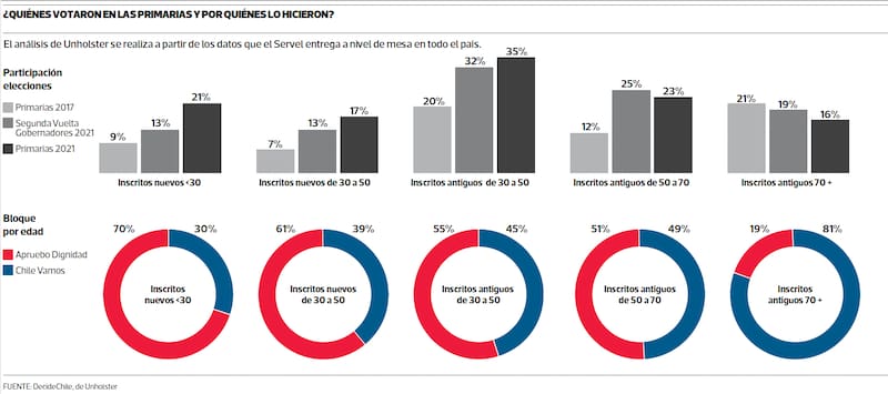 El primer elemento que resalta es la participación. Comparado con los comicios de gobernadores, ocurridos casi un mes antes, los grupos más jóvenes subieron y los de mayor edad bajaron: los menores de 30, según el análisis de DecideChile, pasaron del 13% al 21% de participación; los inscritos nuevos entre 30 y 50 años, de 13% a 17%; y los antiguos en ese mismo tramo de edad, de 32% a 35%: Pero el grupo entre 50 y 70 años pasó de una participación del 25% al 23%, y los mayores de 70 años bajaron del 19% al 16% en su bloque.