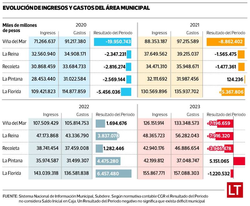 Mirando los números desde el punto de vista del “resultado del periodo”, en tres de los cuatro años ha habido más gastos que ingresos, por lo que el balance financiero de la comuna es precario. “Dada la carga de labores que deben cumplir los municipios, es muy difícil contar con finanzas en equilibrio (...). Administrar estos déficits se ha transformado en la realidad nacional”, relatan desde Recoleta. Además, aseguran que en 2012, al recibir la comuna, el déficit era de $ 12 mil millones y que para 2022 se logró un superávit.