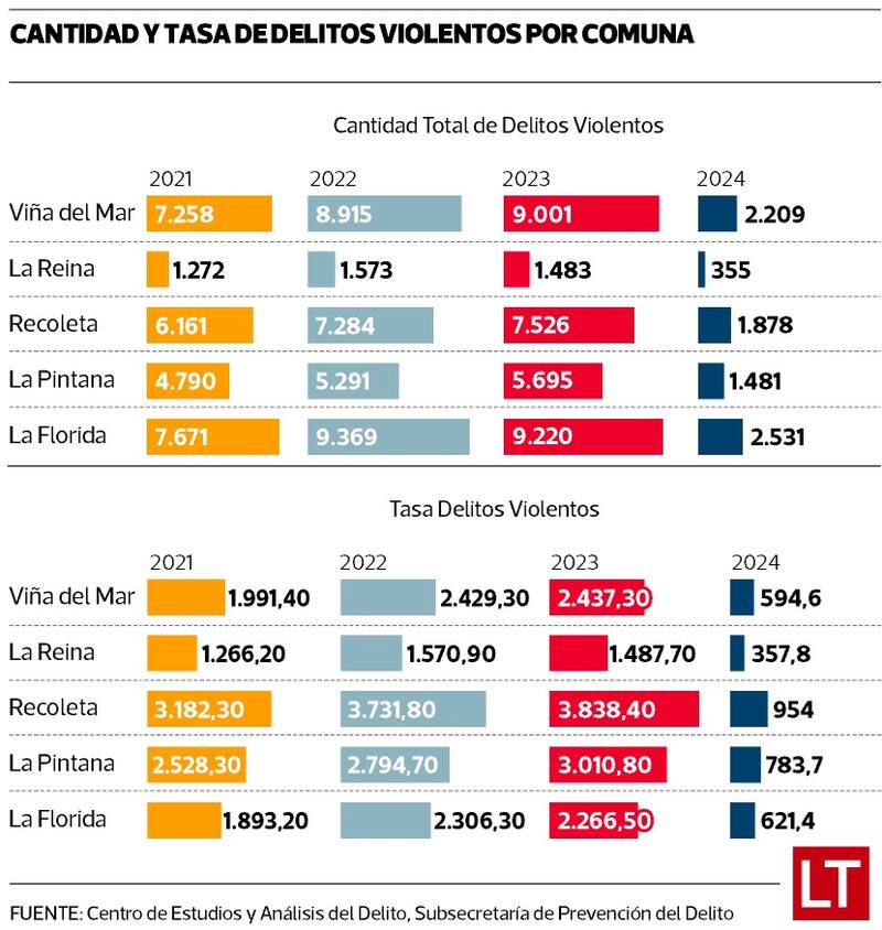 Desde el punto de vista de la tasa, en 2021 La Pintana registró 2.528 casos de delitos violentos cada 100 mil habitantes, menos que en Recoleta y más que en Viña del Mar. Para 2023 la tasa creció a 3.010 hechos por cada 100 mil habitantes. En el municipio explican que entre las medidas que han tomado estos últimos cuatro años están acciones de prevención social, “inversión situacional” como iluminación, cámaras y recuperación de espacios públicos, y acciones de coordinación con otras autoridades.