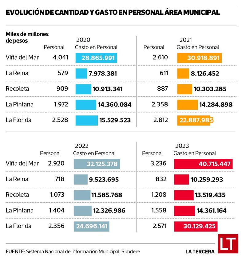 Personal: una parte importante del crecimiento de los gastos de la entidad ha estado en el personal municipal. Entre 2020 y 2023, el costo total en remuneraciones casi se duplicó, con un alza de 94% en toda la plantilla. Es decir, si en 2020 se gastaron $ 15.529 millones en ese ítem, en 2023 se destinaron $ 30.129 millones.