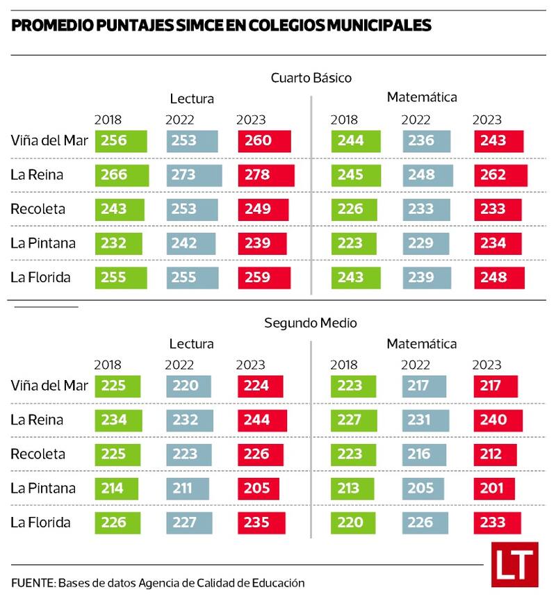 Educación: durante las últimas tres mediciones del Simce, los resultados de los colegios municipales de La Reina han sido de mejoras consistentes, tanto para cuarto básico como para segundo medio. En el primer grupo, el puntaje promedio de lectura pasó de 266 puntos en 2018 a 278 puntos en 2023.