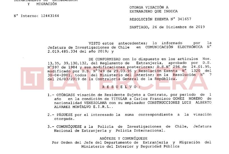 Meses después, y tal como ocurrió con otros jefes del Tren, “Bobby” tramitó ante el entonces Departamento de Extranjería y Migraciones una visa de residente sujeto a contrato de trabajo para poder vivir legalmente en territorio nacional. Así, el 26 de diciembre de 2019 Migraciones otorgó a Gómez Moreno un permiso de un año bajo un supuesto contrato laboral otorgado por la empresa Construcciones Luis Alberto Álvarez Montalvo E.I.R.L. Con ello, tuvo un Rut y una cédula chilena.