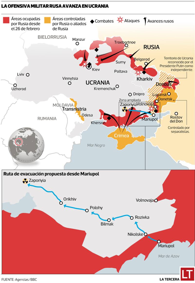 Mariupol ha soportado fuertes bombardeos, una señal de su valor estratégico para Moscú. El control de este puerto del mar de Azov le permitiría a Rusia una continuidad territorial entre sus fuerzas llegadas de la península de Crimea en el mar Negro -que Putin arrebató a Ucrania en 2014- y las de los territorios del Donbás en el este ucraniano, controlados por separatistas prorrusos.