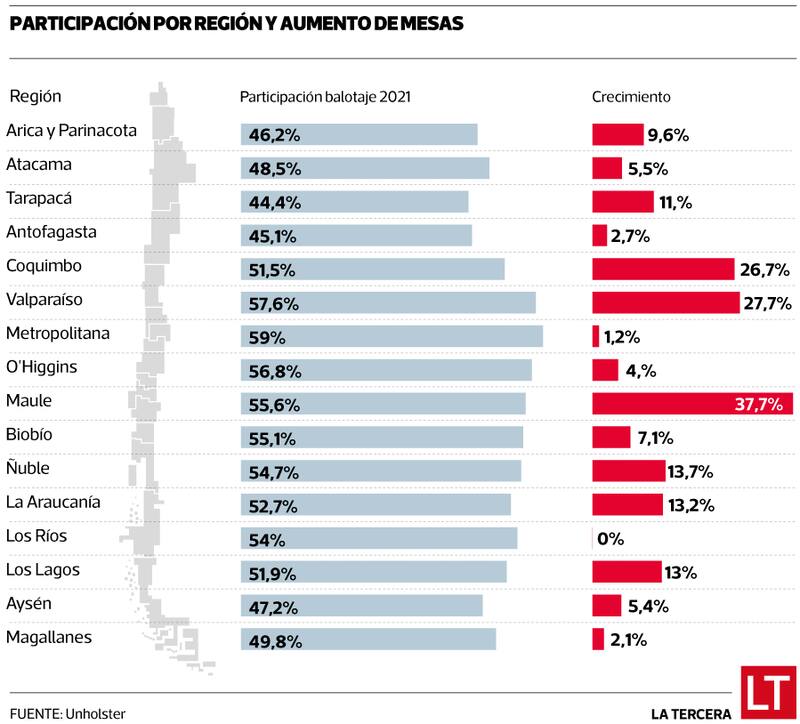 El director de Data Science de Unholster, Cristóbal Huneeus, explica que “si metodológicamente se hace una simple correlación, este incremento de lugares habilitados para votar se da más en regiones donde la participación es más alta”. Huneeus pone como ejemplo el Maule.