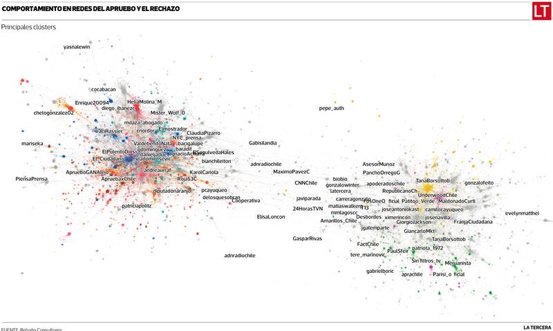 Y, además, se distinguen dos polos donde cada bando, por el Apruebo y el Rechazo, cuenta con perfiles que lideran las interacciones. En esta línea, Díaz argumenta que hay “una estructura muy homogénea y unificada del Apruebo, donde sus grandes transmisores de mensajes son líderes políticos -como la alcaldesa Claudia Pizarro o los diputados Helia Molina y Diego Ibáñez- o del bloque que defiende esa opción”.