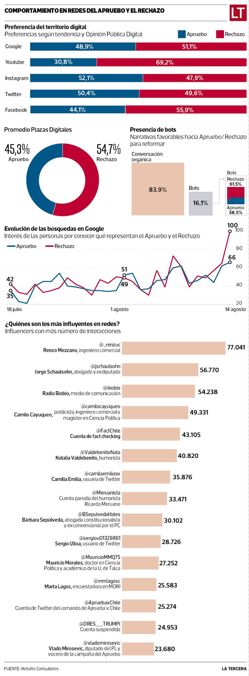 Un estudio del laboratorio de comunicaciones Rebaño da cuenta de que, en sintonía con los sondeos de opinión, el Rechazo tiene una ventaja del 54,7% de las preferencias del territorio digital. Mientras que el Apruebo destaca por su aumento en las búsquedas en Google en las últimas semanas, el Rechazo llama la atención por utilizar más bots y por la ausencia de rostros políticos entre sus figuras más influyentes.