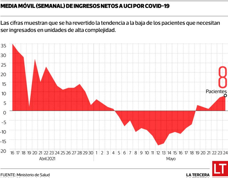 Los datos de la Subsecretaría de Redes Asistenciales, en tanto, muestran que se ha quebrado la tendencia a la desocupación de las UCI y que, actualmente, se está ingresando a más pacientes que los que están dando de alta, semanalmente (media móvil semanal de ingresos netos de pacientes). De hecho, hasta ayer, la ocupación de las UCI llegaba al 93%, sin embargo, la proyección del Minsal apunta a que mañana se elevará al 96%, superando, nuevamente, otro margen sindicado como clave para medir el pulso de la pandemia.