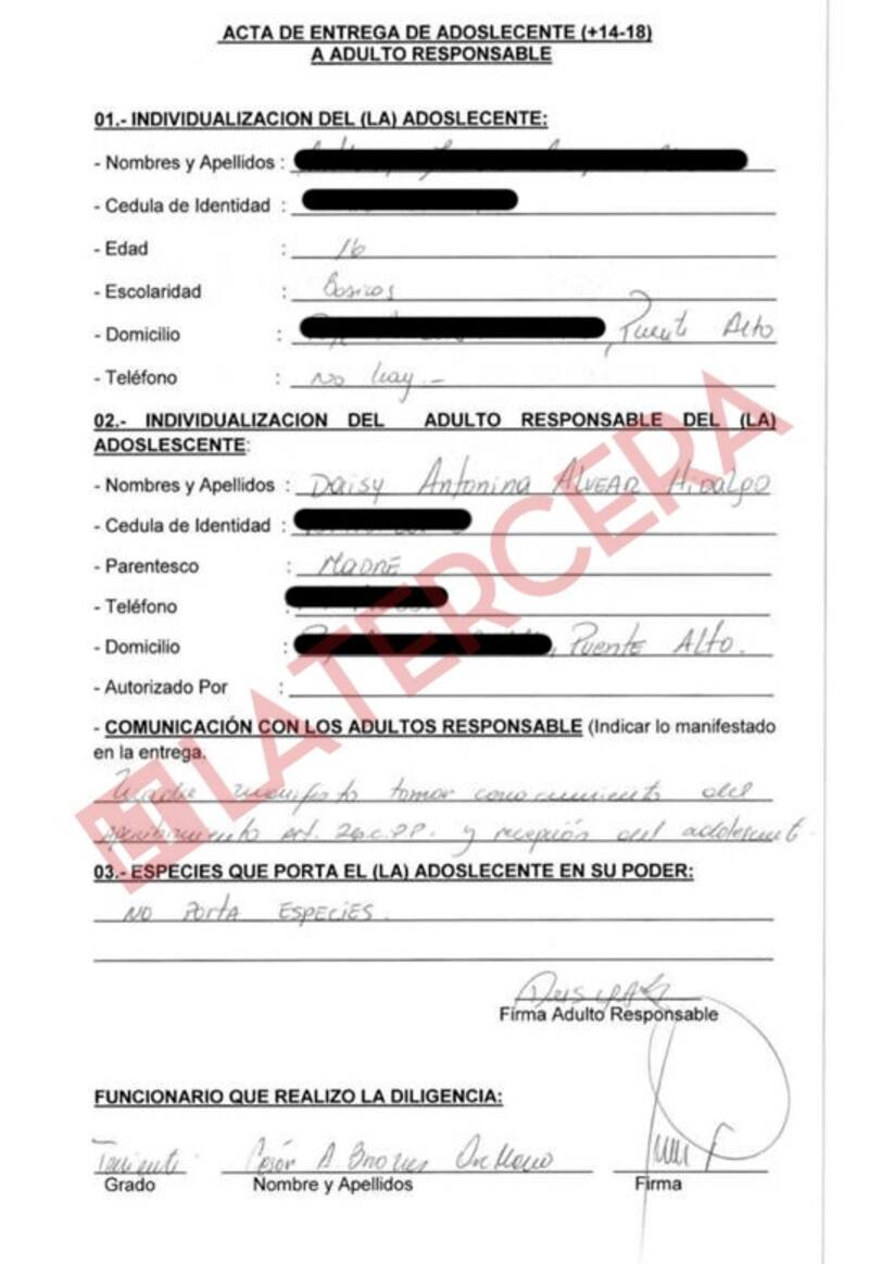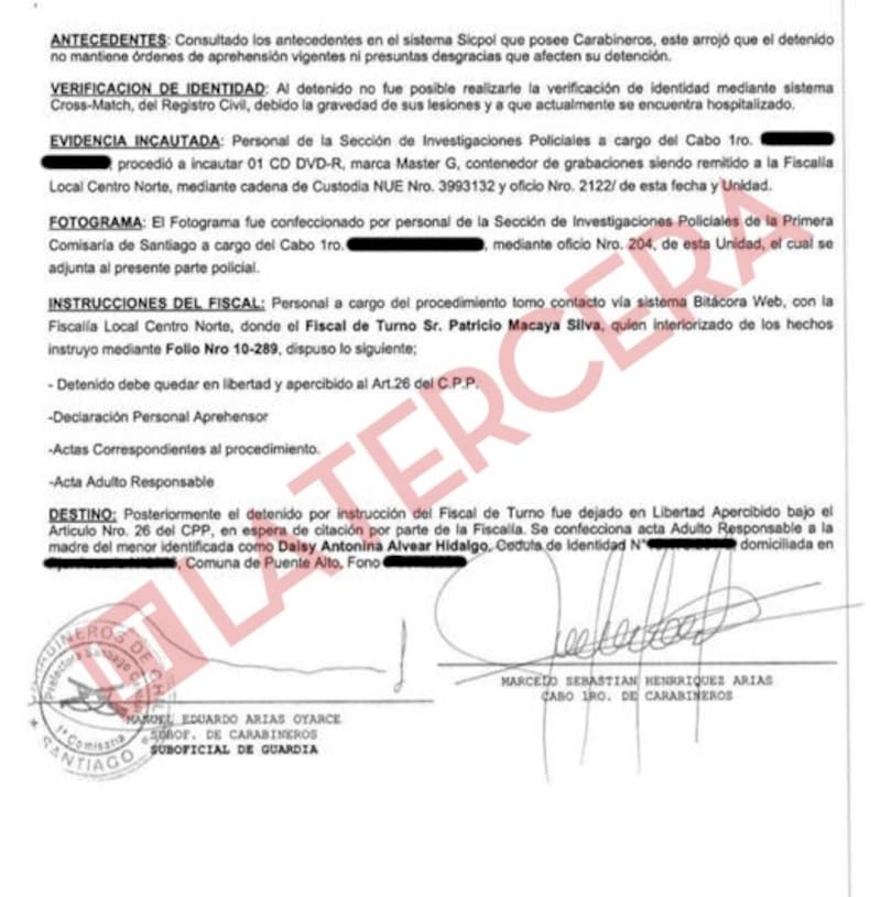 Y por último, el parte policial consigna “el destino” del menor. "Posteriormente, el detenido por instrucción del fiscal de turno fue dejado en libertad bajo apercibimiento bajo el artículo Nro. 26 del CPP, en espera de citación por parte de la Fiscalía. Se confecciona acta Adulto Responsable a la madre del menor, Daisy Antonina Alvear Hidalgo”, dice el documento, firmado por el cabo Marcelo Henríquez y el suboficial mayor Manuel Arias.