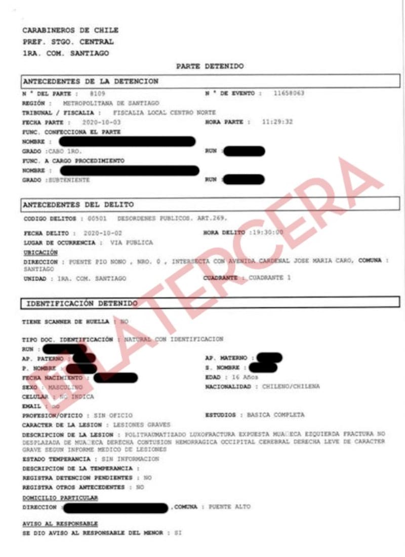 Entonces, ¿de qué se tratan estas actas?, ¿qué dice el parte? La Tercera PM accedió al parte policial, al acta del detenido, el acta de lectura de derechos y el acta de entrega al adulto responsable del menor.