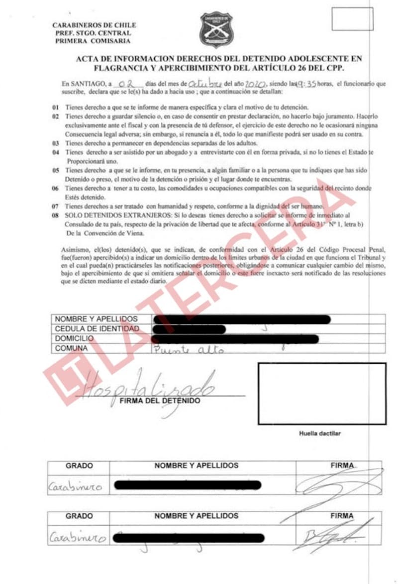 Enseguida, se adjunta el “acta de información de derechos del detenido adolescente en flagrancia y apercibimiento del articulo 26 del CPP”. Allí se relatan todos los derechos del detenido, se identifica al menor, sus datos personales y los carabineros que elaboran el documento que consta de ocho puntos. En la parte que dice “firma del detenido”, solo aparece la palabra “hospitalizado”.