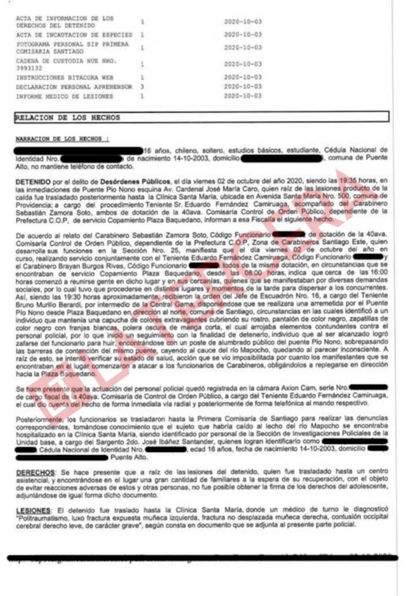 A continuación, se consigna lo “polémico” y cuestionado por el Ministerio Público: “Posteriormente, los funcionarios se trasladaron hasta la Primera Comisaría de Santiago para realizar las denuncias correspondientes, tomándose conocimiento que el sujeto que habría caído al lecho del Río Mapocho se encontraba hospitalizado en la Clínica Santa María, siendo identificado por personal de la Sección de Investigaciones Policiales, a cargo del sargento segundo, José Ibáñez Santander, quienes logran identificarlo como (tachado),de 16 años”, con domicilio en Puente Alto.