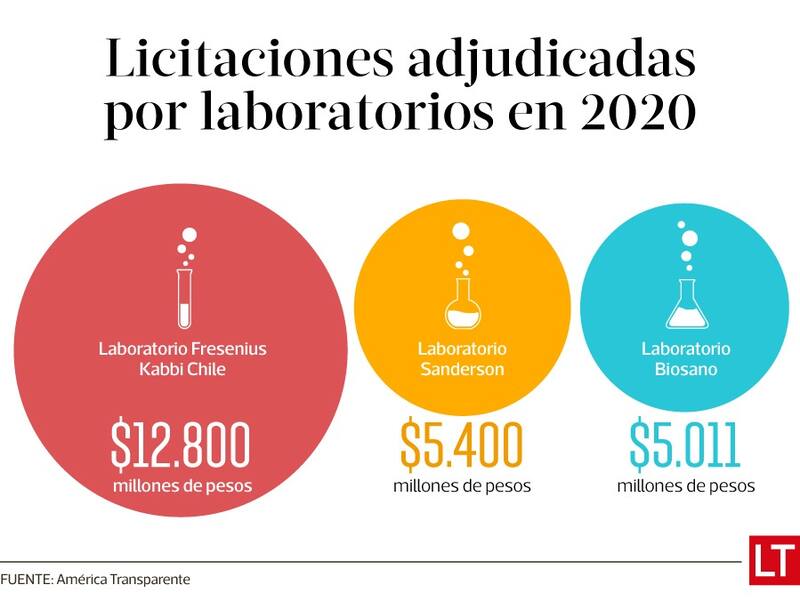 784 licitaciones que suman 23.300 millones de pesos (aprox US$ 29 millones) se adjudicaron entre enero y junio los laboratorios Fresenius Kabbi Chile, Sanderson y Biosano, según un análisis de la Fundación América Transparente.