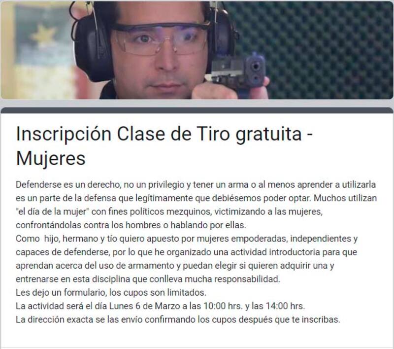 En esa misma línea, el parlamentario agrega que “como hijo, hermano y tío apuesto por mujeres empoderadas, independientes y capaces de defenderse, por lo que he organizado una actividad introductoria para que aprendan acerca del uso de armamento y puedan elegir si quieren adquirir una y entrenarse en esta disciplina que conlleva mucha responsabilidad. Les dejo un formulario, los cupos son limitados”.