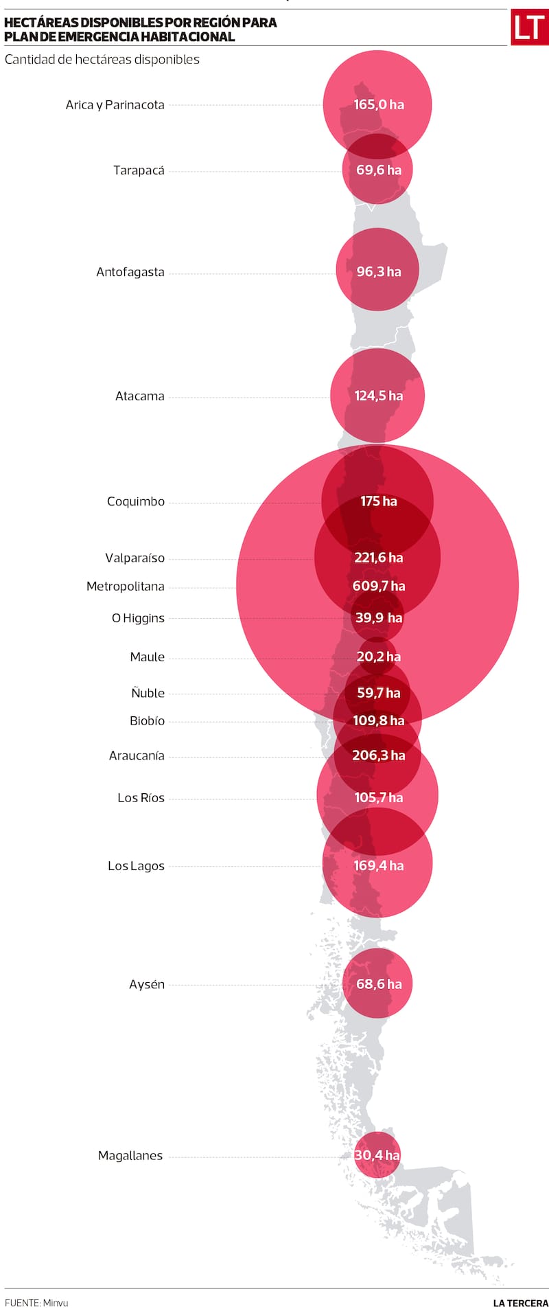 Aunque las regiones de Arica y Coquimbo alcanzan el total de 165 ha y 124,5 ha disponibles, respectivamente, dando buen augurio para el avance de soluciones habitacionales, el caso de la región de Tarapacá es alarmante. Con 69,6 ha disponibles en todo su territorio y con una meta de más de 9 mil viviendas en toda la región, la falta de terrenos le ha significado tener cerca de dos mil viviendas terminadas hasta diciembre.