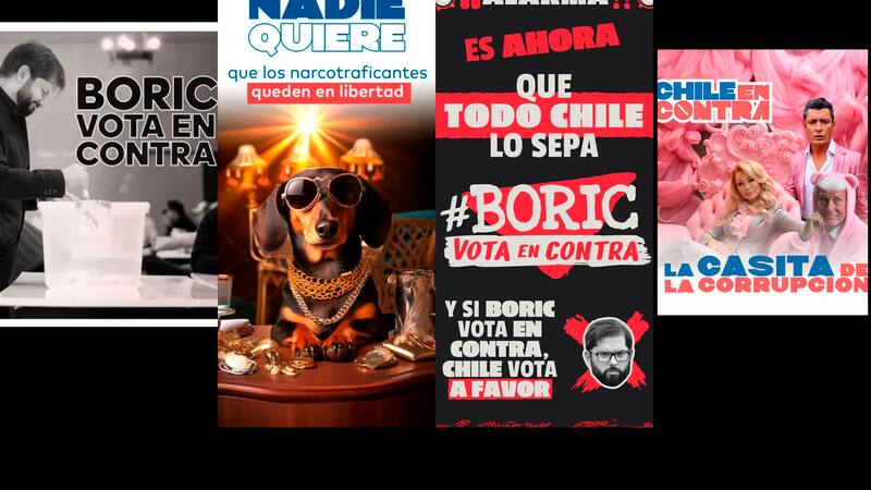 Horas después, los mismos dirigentes comenzaron a difundir un video en que se van intercalando dos imágenes. En una se ve a Boric en negro y en otra se ve la bandera de Chile a color. El video, que dura 30 segundos, tiene de fondo un grupo de personas que repite una y otra vez, como si fuera un mantra, “Boric vota ‘En contra’, Chile vota ‘A favor’”. A medida que avanza, va aumentando la velocidad.