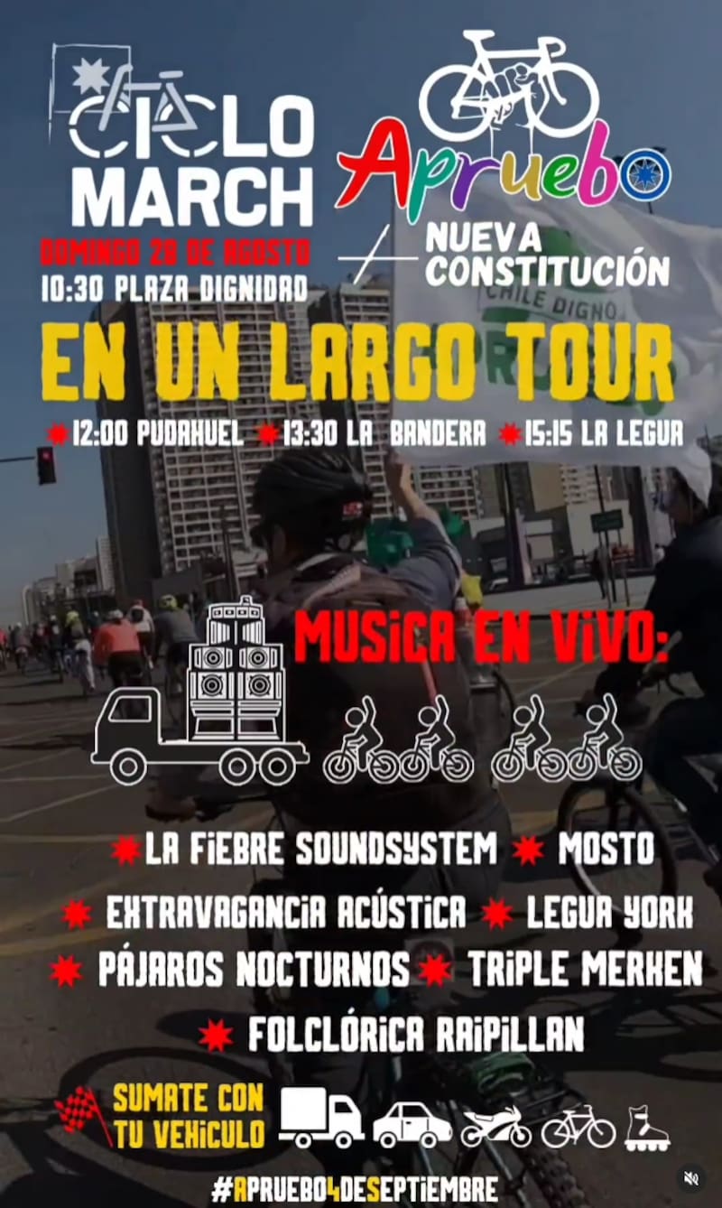 “Todxs invitados a juntar fuerzas para este 4 de septiembre, pedaleando en una ciclomarcha por el #APRUEBO. Ya hemos recorrido el oriente, el sur, el poniente y norte de Santiago y en este cierre de campaña de la comunidad ciclista, varios artistas se sumarán entregando música en vivo tanto en la ruta como en los 3 puntos de intervención. ¡¡¡Las calles no se sueltan y los pedales no paran!!!”, se puede leer en sus publicaciones a través de redes sociales.