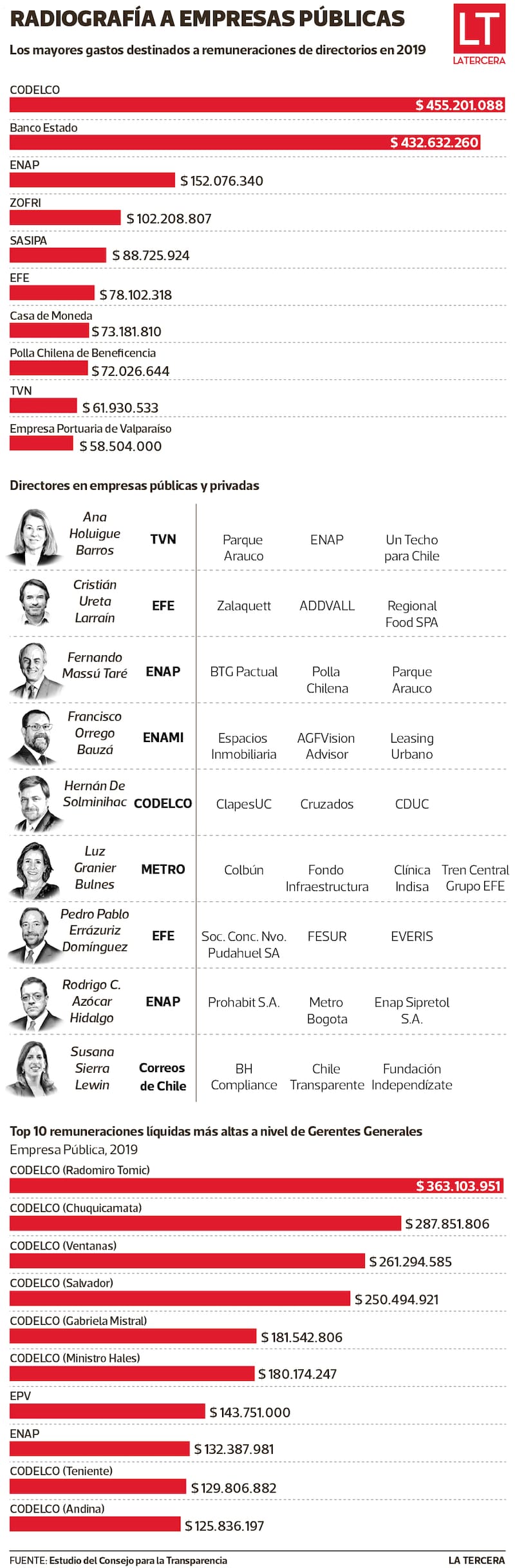 Un estudio del Consejo por la Transparencia (CPLT) detalló el alto monto que suman las remuneraciones en las planas ejecutivas: el total percibido por todos los gerentes de empresas públicas en 2019 ascendió a $7.313 millones, siendo Codelco la compañía que más pagó a sus ejecutivos, con $2.152 millones. Le siguen ENAP y Polla Chilena de Beneficencia con $1.067 millones y $496 millones, respectivamente.