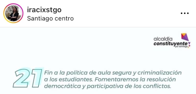Ejemplos como esos no son, sin embargo, los únicos que desde Santiago se han referido en esos términos a la ley. De hecho, la propia alcaldesa Hassler durante la campaña para el sillón municipal publicaba en sus redes sociales: “Fin a la política de Aula Segura y criminalización a los estudiantes. Fomentaremos la resolución democrática y participativa de los conflictos”.