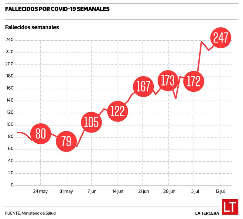 No obstante esa alentadora cifra, el número de fallecidos por Covid-19 ha aumentado durante los últimos meses. Si la semana del 24 de mayo se registraron 80 muertes a causa del virus, la última semana ascendió a 247. Es decir, en casi dos meses, se configura un aumento del 200% (ver gráfico).