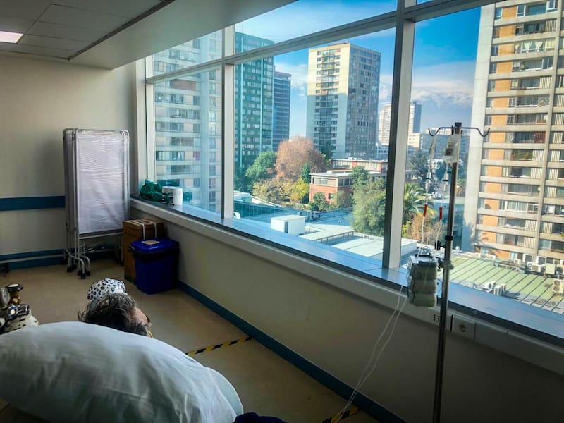 “Este fue nuestro paciente más querido, uno de los primeros que tuvimos muy muy graves. Nos encariñamos mucho, le costó harto salir adelante, pero de a poco empezó a repuntar. Apenas pudimos, aprovechamos esa linda vista que teníamos y lo sentamos frente a la ventana. Hubo hasta lágrimas de la emoción”, relata Elizabeth sobre un paciente que iniciaba su recuperación tras un par de semanas en ventilación.