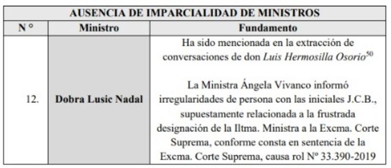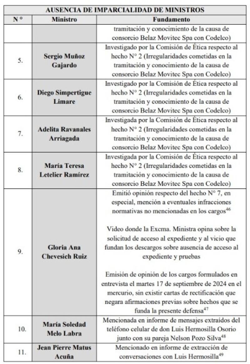 De igual forma, detallan varios elementos respecto de por qué prácticamente todos los supremos carecerían de la imparcialidad necesaria para juzgarla, que sólo la Segunda Sala cumple con las normas respecto del orden con que se tramitan causas, y que nunca reveló información reservada de causas.