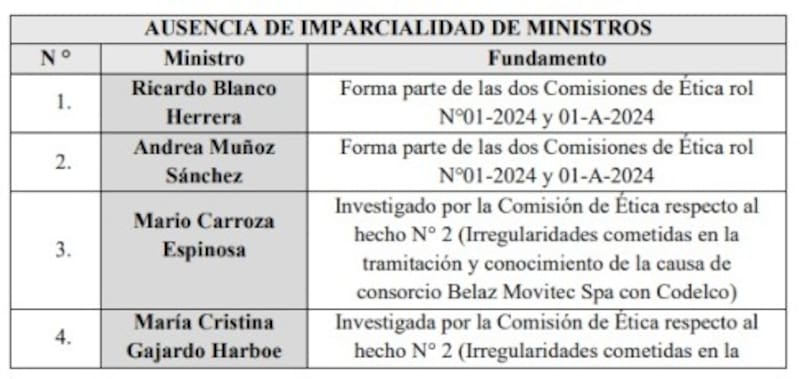 Exponen, en ese sentido, que la celeridad en la causa “no fue exclusivo de la inculpada, consta en el expediente que con la presidencia del Ministro Muñoz la causa mantuvo la velocidad. Así, presentado un incidente de nulidad de la cuprífera nacional, al día siguiente se dictó resolución de dese cuenta, ese mismo día se dio cuenta a la sala y se dictó resolución ¿La rapidez es de exclusiva responsabilidad de 1 Ministra? ¿Qué rol cumplen los otros Ministros y abogados integrantes?”.