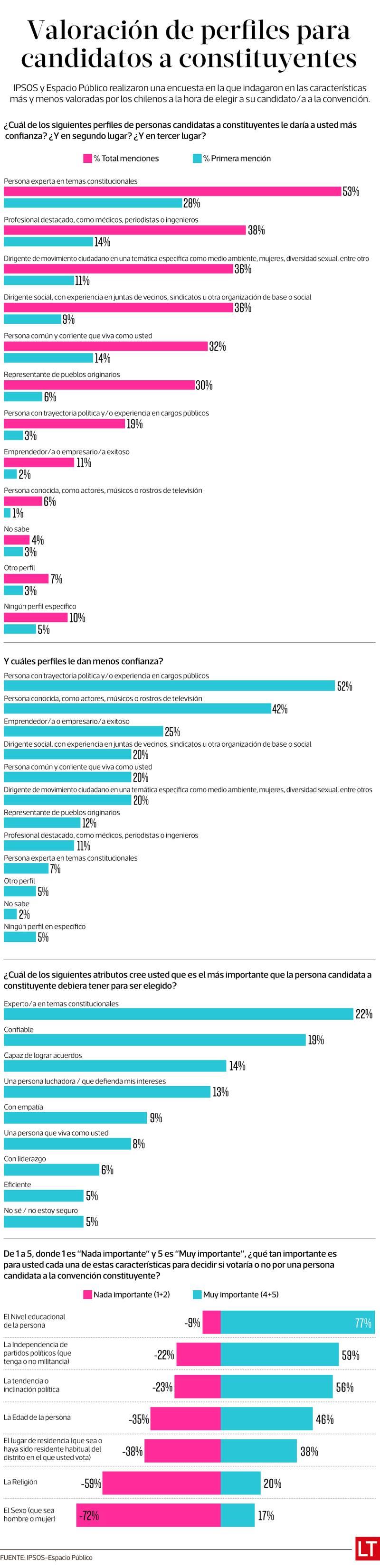 “Hay tres elementos clave. El constituyente ideal es experto en temas constitucionales y profesional destacado. Personas “comunes y corrientes”, dirigentes sociales y de ONGs tienen una valoración intermedia. El constituyente no-ideal tiene trayectoria política, es empresario y/o rostro televisivo, ese yo diría que es el principal resultado de la encuesta. Quizás, haya que dibujar una diferencia conceptual entre expertos y políticos”, dice Diego Pardow, presidente ejecutivo de Espacio Público.