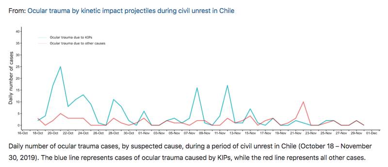 Cinco días antes el general director de Carabineros, Mario Rozas, dio la orden de acotar el uso de los perdigones a “todas aquellas situaciones de real peligro para nuestros carabineros y para real peligro para nuestros conciudadanos”, además de situaciones de “amenaza cierta e inminente” de ataque a la propiedad pública o privada. Sin embargo, el estudio muestra que siguieron llegando más pacientes con traumas oculares (ver imagen). Luego, cuatro días después, Rozas suspendió su uso: “Como una conducta de prudencia, se ha ordenado suspender el uso de esta munición no letal como herramienta antidisturbios. En consecuencia, solo podrá ser utilizada al igual que las armas de fuego como una medida extrema y exclusivamente para la legítima defensa cuando haya un peligro inminente de muerte”. Recién en ese momento se registró una caída de los casos.