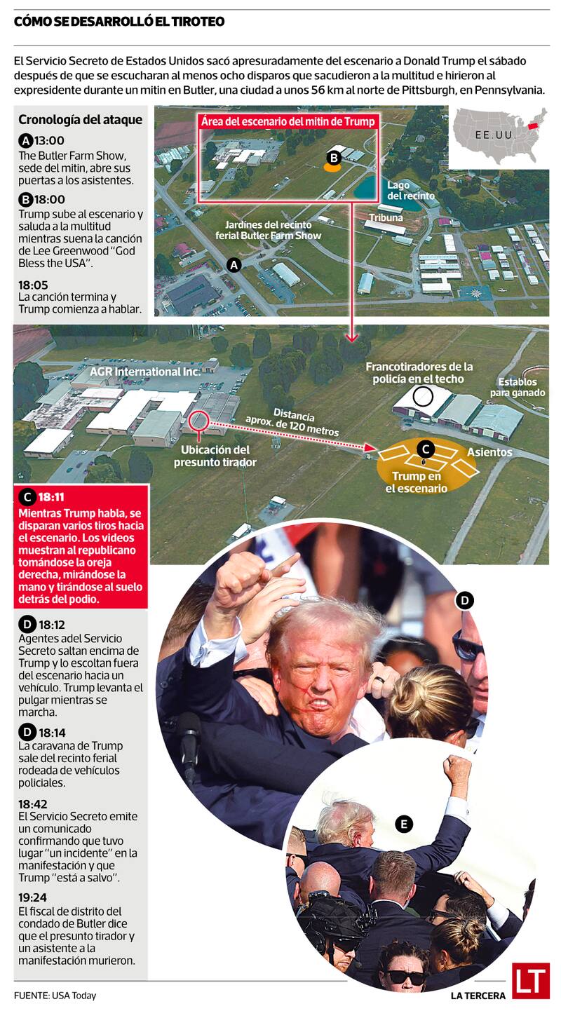 “Nos dimos cuenta de que el tipo se arrastraba, como un oso, por el tejado del edificio de al lado, a 15 metros de nosotros”, declaró un testigo a BBC News. Todavía no está claro cuándo se enteró el Servicio Secreto de esta primera amenaza flagrante. Luego llegaron los disparos de Crooks, los que fueron respondidos por los contra-francotiradores ubicados en los edificios alrededor. Transcurrieron 43 segundos entre que Crooks apretó el gatillo por primera vez y su neutralización, detalló un agente del Servicio Secreto a CNN.
