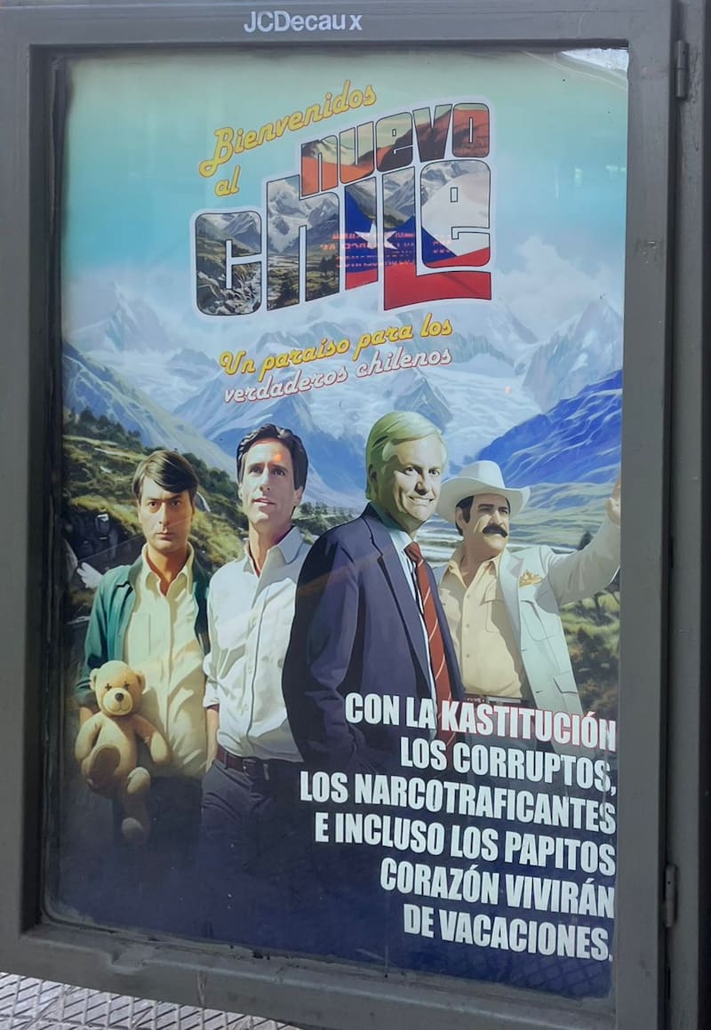 “Bienvenidos al nuevo Chile: un paraíso para los verdaderos chilenos. Con la Kastitución, los corruptos, los narcotraficantes e incluso los papitos corazón vivirán de vacaciones”, se leía por un lado, que también incluía imágenes de los excandidatos presidenciales José Antonio Kast (Partido Republicano) y Franco Parisi (Partido de la Gente), además del exconsejero constitucional Luis Silva (Partido Republicano).