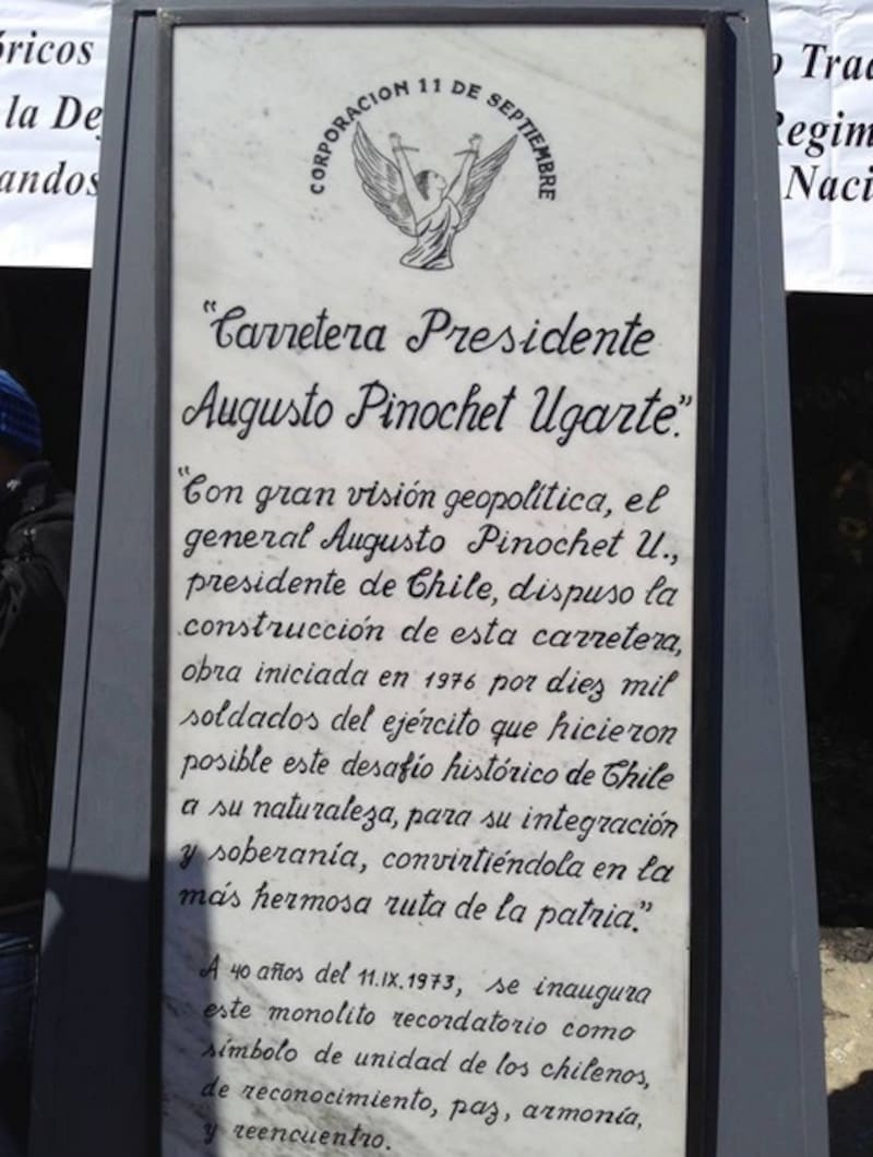 Por último, en el sector rural de Caleta La Arena, ubicada a 40 kilómetros de Puerto Montt, la Corporación 11 de Septiembre instaló en 2013 un monolito en recuerdo de Augusto Pinochet por la construcción de la Carretera Austral y que buscaba ser un motivo de conmemoración de los 40 años del golpe “rememorando la construcción de esta gigantesca obra vial que unió por tierra e integró a una parte importante de nuestro territorio austral”, sostenía el comunicado de aquella época.