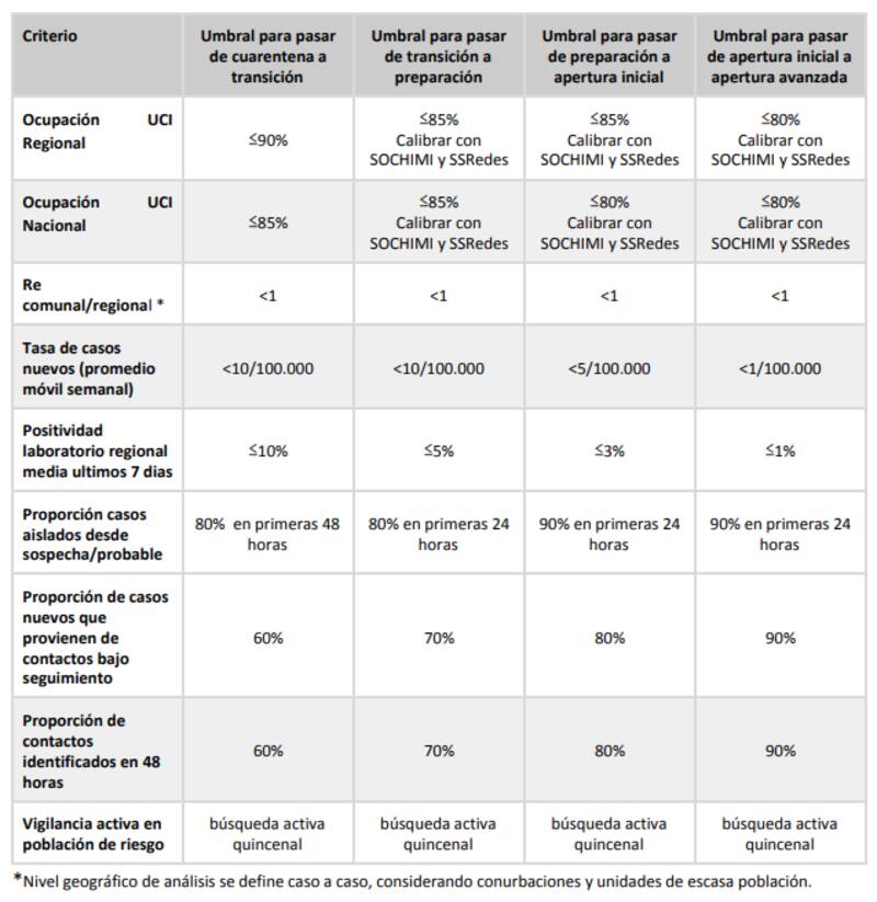 La minuta deja en evidencia que el consejo es crítico de los umbrales establecidos por el gobierno. Tanto es así, que optaron por hacer su propia tabla, en la cual los estándares, dicen, son aún más exigentes, considerando el sensible proceso de desescalada en una pandemia como la del virus Sars-Cov-2.