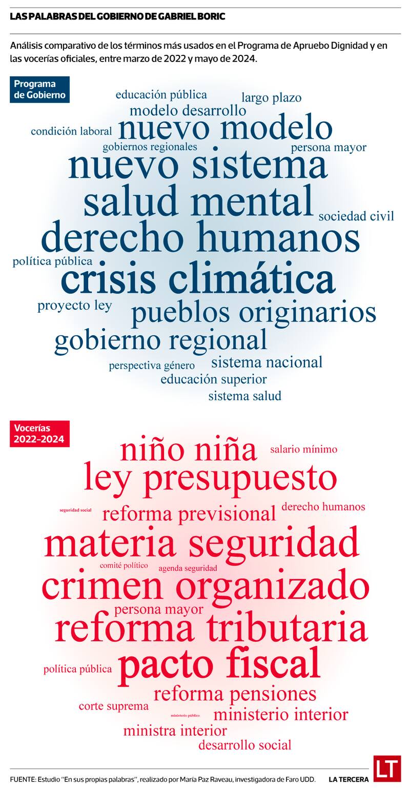 En el papel, parecen dos gobiernos radicalmente distintos. En el programa de Apruebo Dignidad los términos más citados eran ”crisis climática”, “derechos humanos”, “salud mental”, “nuevo sistema” y “nuevo modelo”. Sin embargo, ellos desaparecieron o perdieron absoluta gravitación en las vocerías de los dos primeros años de la presidencia de Gabriel Boric. De acuerdo a un análisis de Faro UDD, entre marzo de 2022 y mayo de 2024, las palabras más abordadas en la comunicaciones oficiales de La Moneda son “pacto fiscal”, “crimen organizado”, “reforma tributaria” y “materia seguridad”.